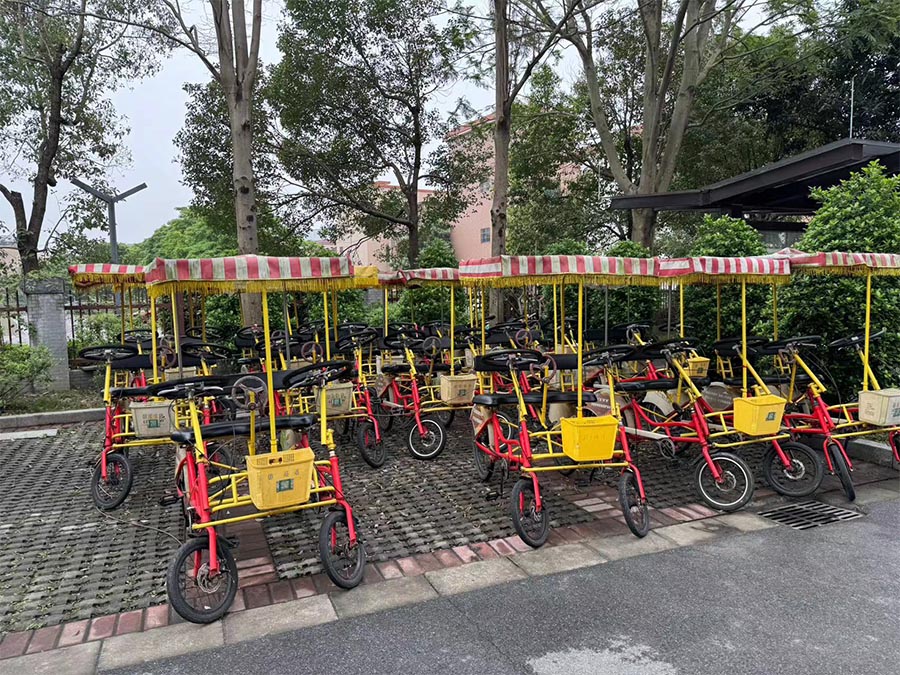 可提供带遮阳棚的单排双人自行车、双排四人自行车等